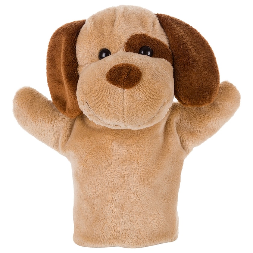 Hånddukke i form av en søt hund. Trykket gjøres på brystet på hunden. En morsom gave til alle barn som elsker hunder.
