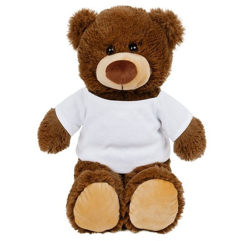 Brun kosebamse med hvit t-skjorte. Trykket gjøres på t-skjorten til kosebamsen. T-skjorten leveres separat fra bamsen. En koselig bamse som garantert blir barnas favoritt.