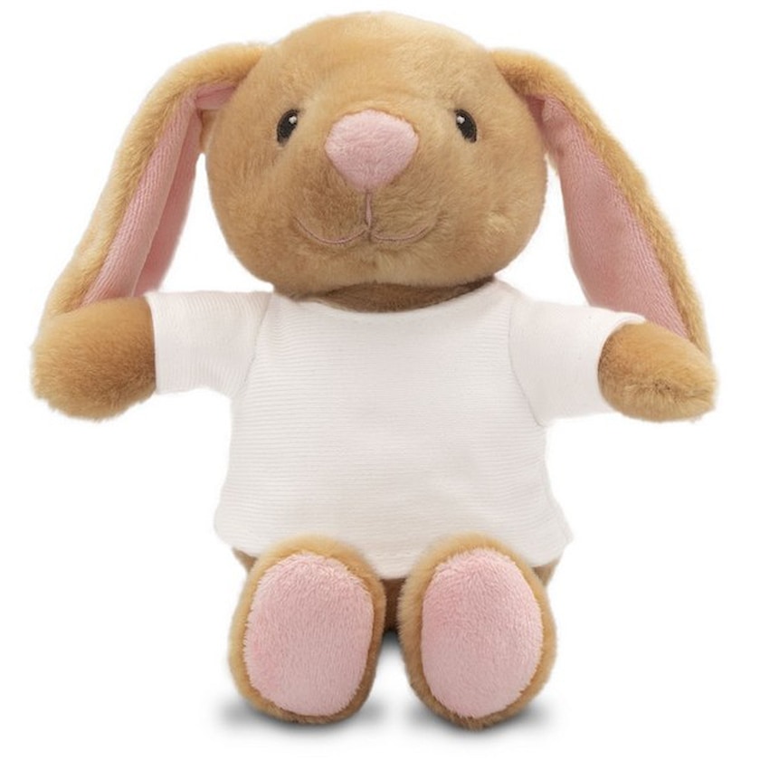 Koselig kanin med hvit t-skjorte. Honey, er laget av resirkulerte PET-flasker (RPET) og er sertifisert i henhold til Global Recycled Standard. Trykket gjøres på t-skjorten som leveres separat fra kosedyret.