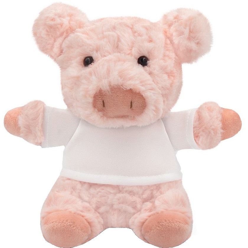 Kosedyr i form av en søt gris. Oswald har en hvit t-skjorte som påføres trykket. T-skjorten leveres separat fra kosedyret.