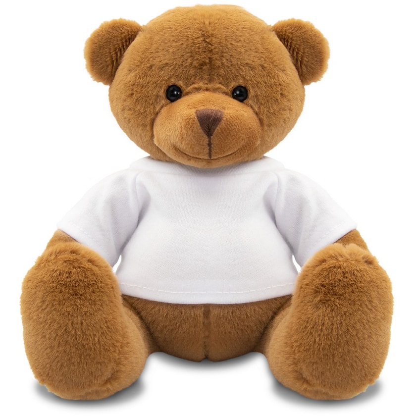 Koselig bamse med trykkbar, hvit t-skjorte. Bamsen Teddy er laget av plysj og er 17 cm høy. T-skjorten leveres utenom bamsen.