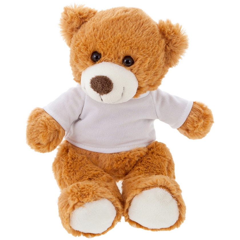 Glad bamse med hvit t-skjorte. Trykket skjer på bamsens t-skjorte. T-skjorten leveres separat fra bamsen. En glad bjørn som sprer glede!