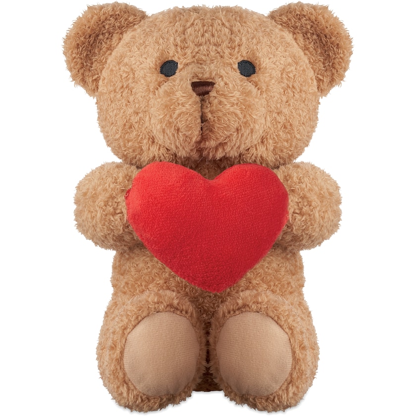Kosebamse som holder et rødt hjerte. Øynene, nesen og munnen til kosebamsen er brodert.