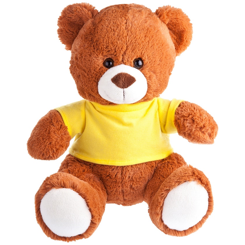 Flott kosebamse med gul T-skjorte. Trykket skjer på trøyen.