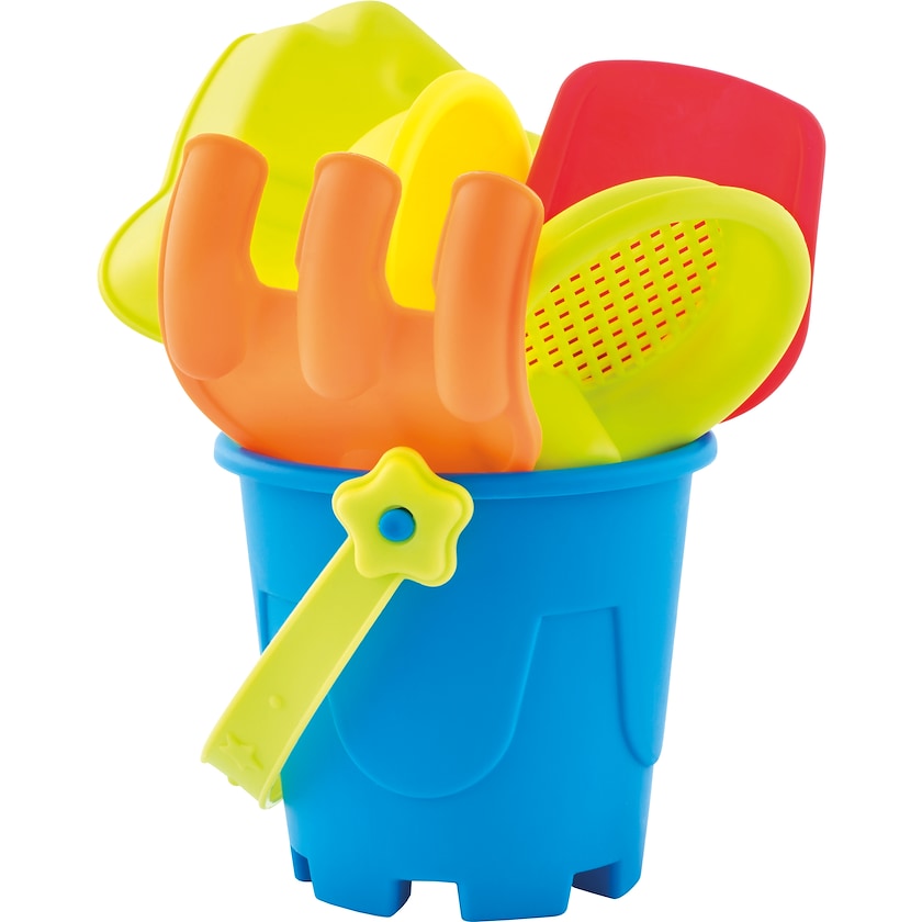 Strandbøtte med spade, krafse og to former. Alle deler kommer i tilfeldige farger. Trykket gjøres på nettingposen, se trykkmalen for mer informasjon. Bestill en strandbøtte med trykk hos Axon Profil!