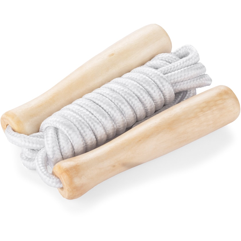 Hoppetau til både barn og voksne. Hoppetauet har håndtak av tre og tau av polyester. Merking gjøres med trykk eller lasergravering på ett av håndtakene.