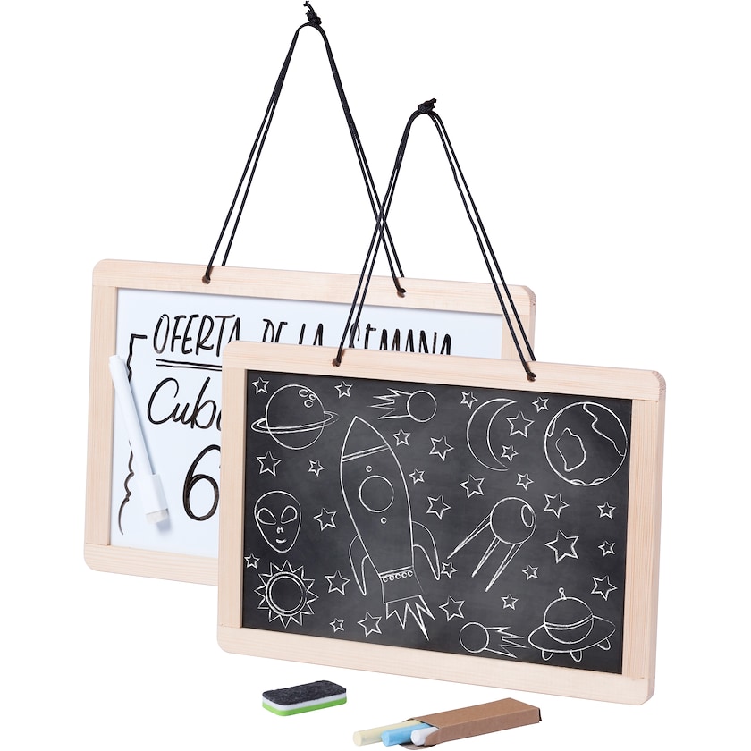 Tavle med whiteboardtavle på baksiden. Leveres med tre tavlekritt, en filtpenn samt en svamp. Merking skjer enten med lasergravering eller trykk i en farge. Bestill tavler med trykk hos Axon Profil!