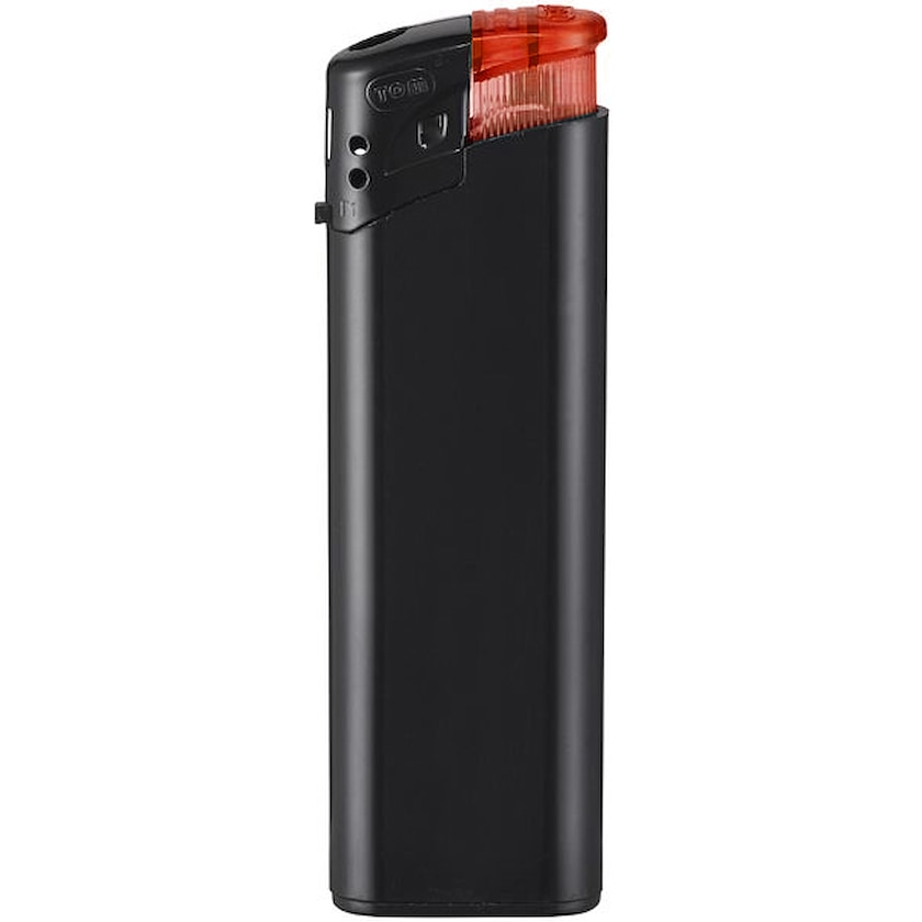 Svart, elektronisk lighter med farget, transparent tenningsknapp. Regulerbar flamme. Lighteren er TUV-sertifisert og er sikkerhetstestet.