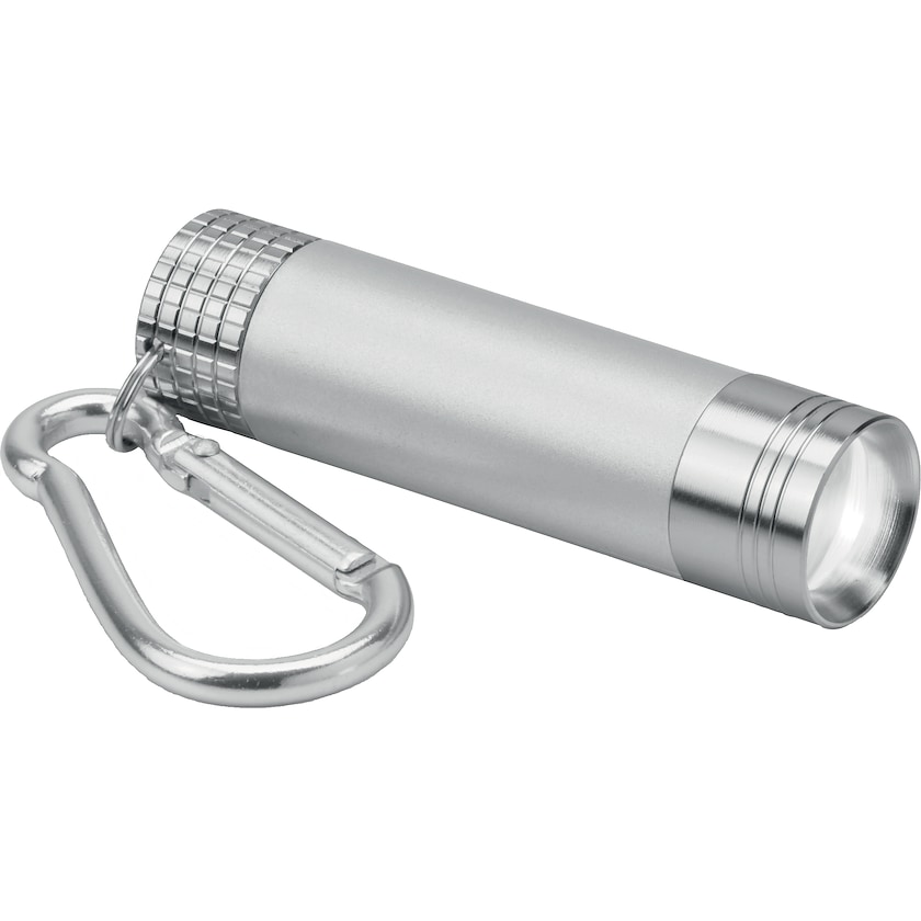 Uttrekkbar lommelykt der logoen din lyser opp. Lommelykten er laget av aluminium og bruker 4 stk. LR44-batterier (inkludert). Etter lasergravering lyser motivet opp.