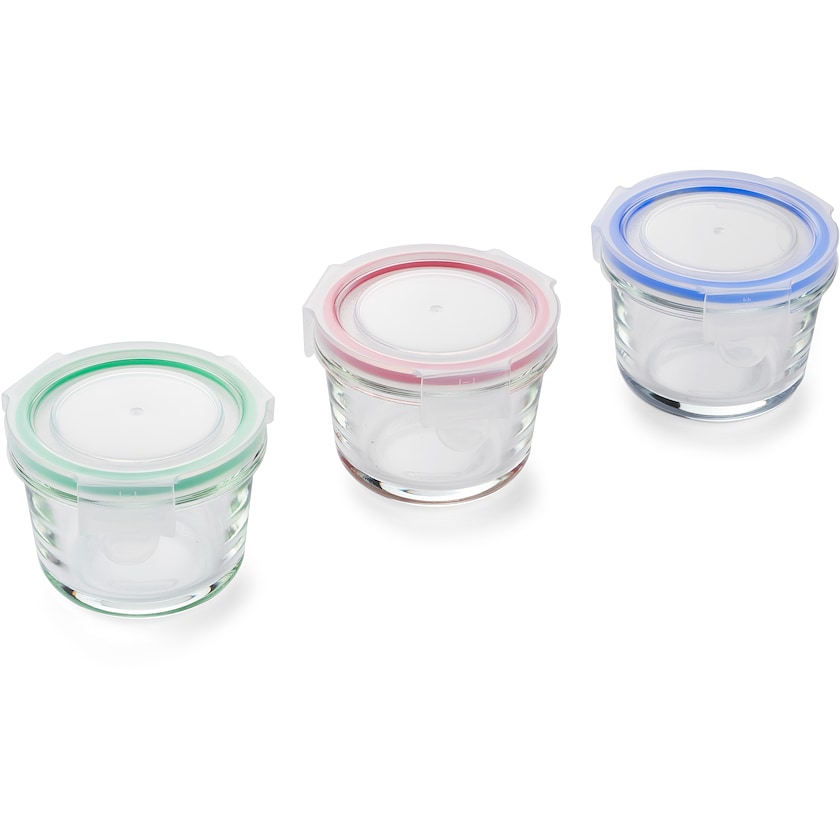 Sett med tre små krukker. Krukkene er laget av brosilikatglass som tåler store temperaturforskjeller. Prisen for trykk inkluderer trykk på en av krukkene. Krukkene kan problemfritt vaskes i oppvaskmaskin, settes i mikrobølgeovn, stekeovn og fryser.