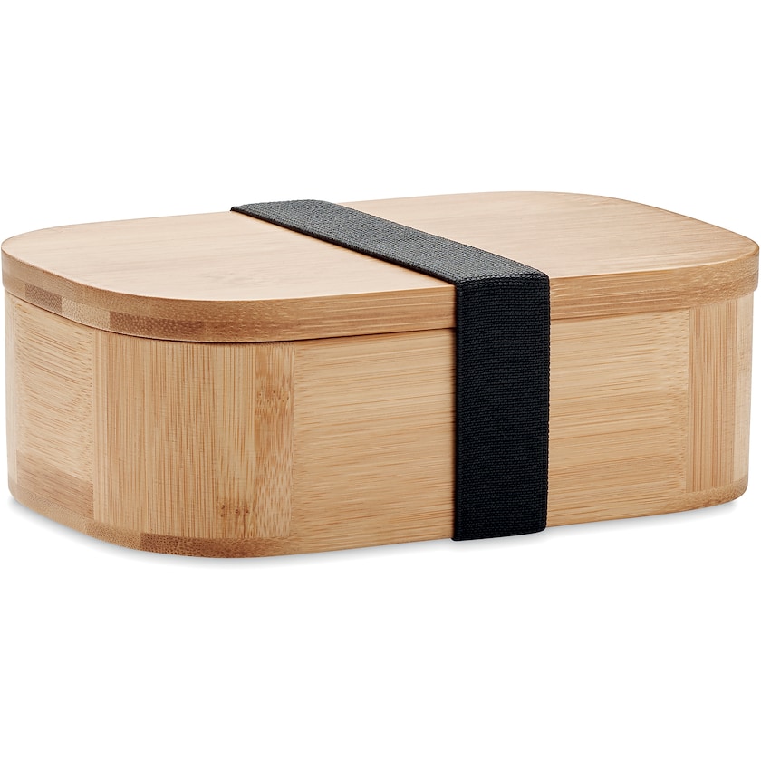 Matboks av ekte bambus. Den innvendige avdelingen kan flyttes slik at størrelsen på oppbevaringsrommene endres. Lokket holdes på plass med et elastisk nylonbånd. Matboksen er bare egnet til tørr mat.