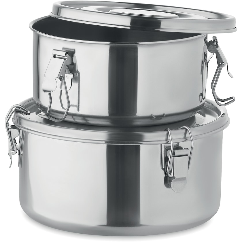 Sett med to matbokser av rustfritt stål. Lugo, har kraftige sidespenner som gjør at maten oppbevares på en trygg måte. Matboksene rommer henholdsvis 45 og 90 cl. Kan vaskes i oppvaskmaskin. Prisen på lasergravering gjenspeiler merking på én av matboksene.