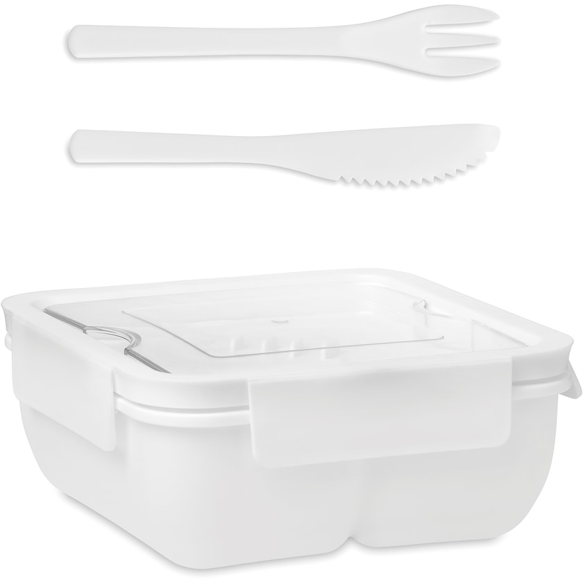 Matboks med to rom og tilhørende bestikk. Bestikket er festet i lokket når det ikke er i bruk. Perfekt til alle som liker å ta med seg egen lunsj på jobben.