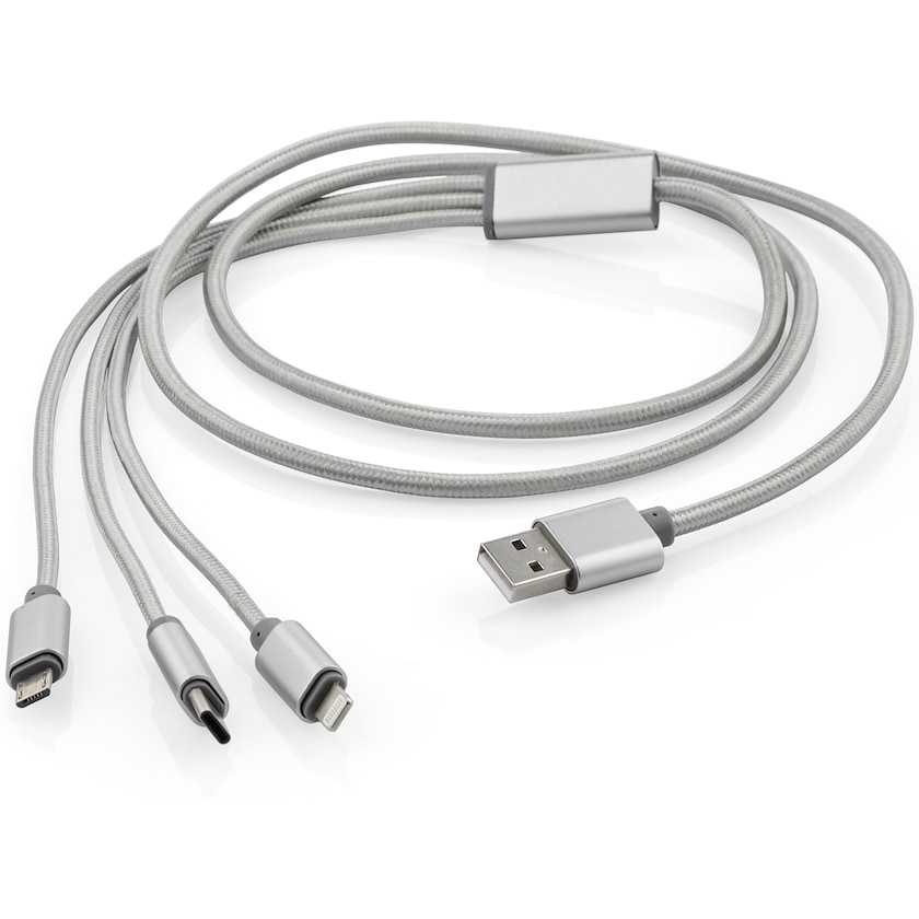 Mobilkabel med tre ulike kontakter. Mega har C-type uttak, mikro-USB-uttak, samt uttak for iPhone 5 eller senere. Merking skjer med lasergravering.