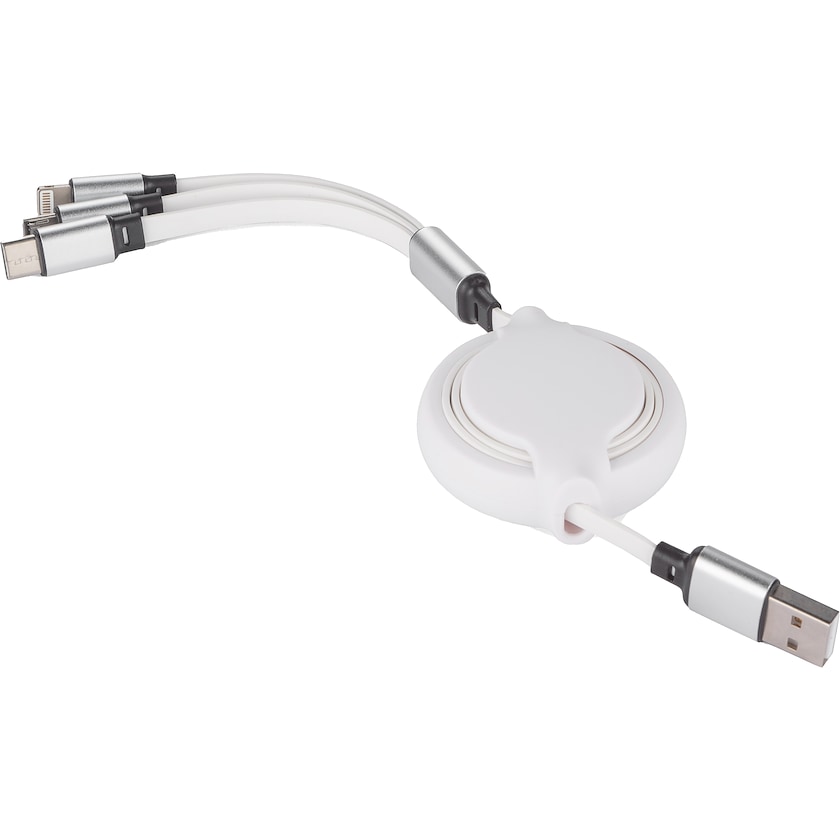 Uttrekkbar 3-i-1-kabel. Har uttak type-c, lightning og mikro-USB. Ekspanderer 115 cm.