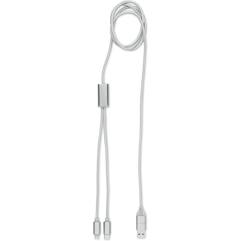 Ladekabel av aluminium med trykk eller lasergravering. Har inngang av type 2-i-1 USB-C samt USB-A. Utgangen er av typen mikro-B (2 i 1 plugg), USB-C og mikro-B. Kabellengden er 120 cm