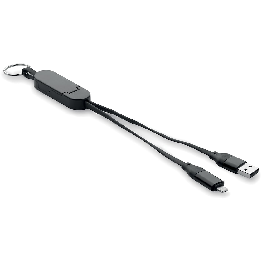 Ladekabel som også fungerer som mobilstativ. Kabellengden er 26 cm. Inngang 2-i-1 USB-C og USB-A. Utgang USB-C og mikro-B (2-i-1 plugg).