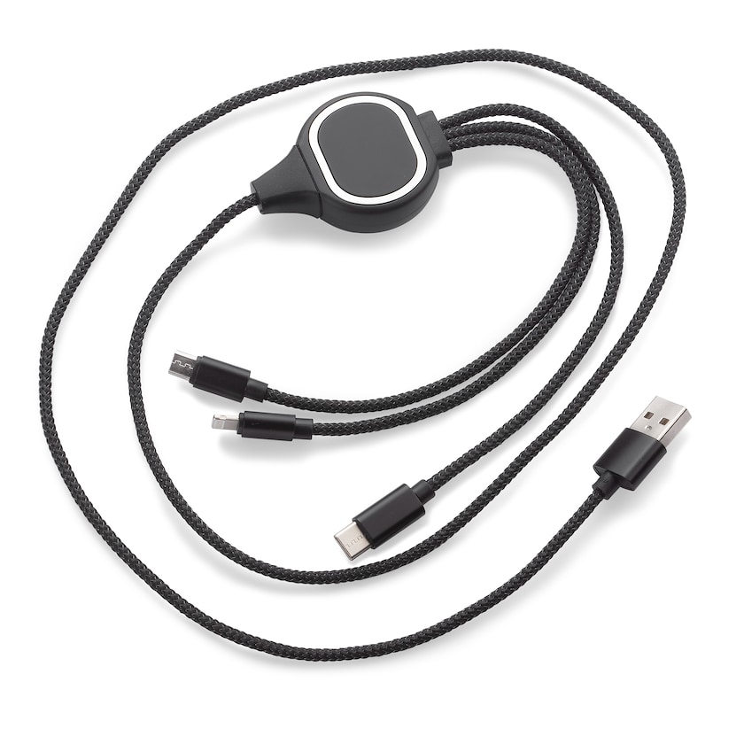 3-i-1-kabel med opplyst logo. Kabelen har mikro-USB, USB-C og lightning (iPhone). Kablene kan kun brukes til lading. Når en av kablene er i bruk, bli den lasergraverte logoen selvlysende.