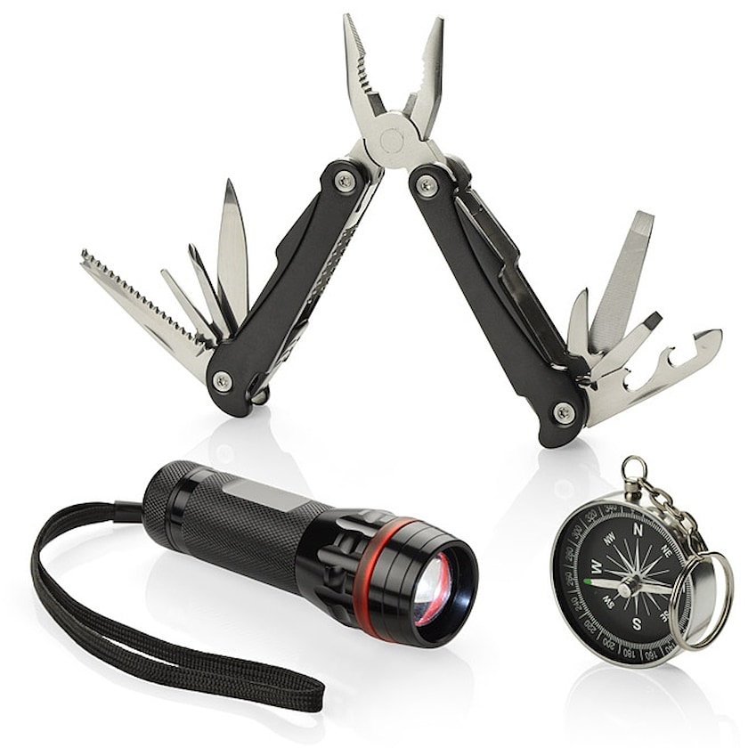 Påkostet gavesett med multiverktøy, kompass og lommelykt. Eksklusivt gavesett som inneholder lommelykt og multiverktøy. Lommelykten har en veldig sterk lysdiode, justerbart lys med zoomfunksjon, samt tre lystyper; sterk, svak og blinkende. Både lommelykten, multiverktøyet og kompasset er laget av metall og leveres i en elegant, sort gaveeske. Merking skjer med lasergravering og maks merkestørrelse er 80 x 20 mm for lommelykten og 60 x 7 mm for multiverktøyet. Merking er ikke mulig på kompasset.