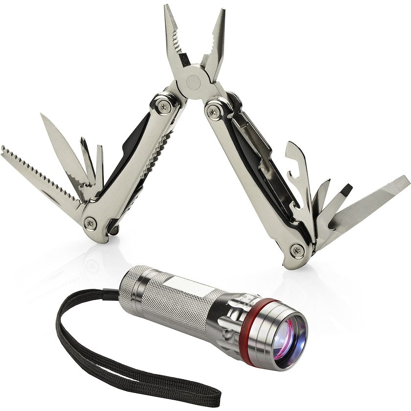 Eksklusivt gavesett som inneholder lommelykt og multiverktøy. Lommelykten har en veldig sterk lysdiode, justerbart lys med zoomfunksjon, samt tre lystyper; sterk, svak og blinkende. Både lommelykten og multiverktøyet er laget av metall og leveres i en elegant, sort gaveeske. Merking skjer med lasergravering og maks størrelse på merkingen er 80 x 20 mm på lommelykten og 60 x 7 mm på multiverktøyet.