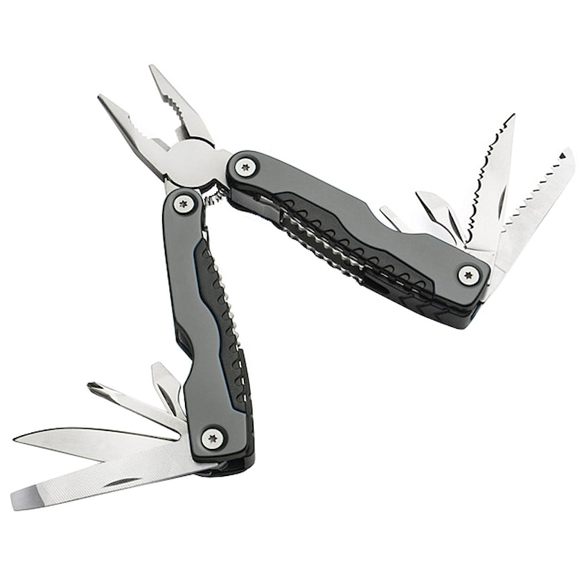 Robust multiverktøy med håndtak av metall. Inneholder tang, tresag, korketrekker og flaskeåpner, tre og metallfil, rett og stjerneformet skrutrekker og to kniver. Lasergraveringen skjer på ett av håndtakene.