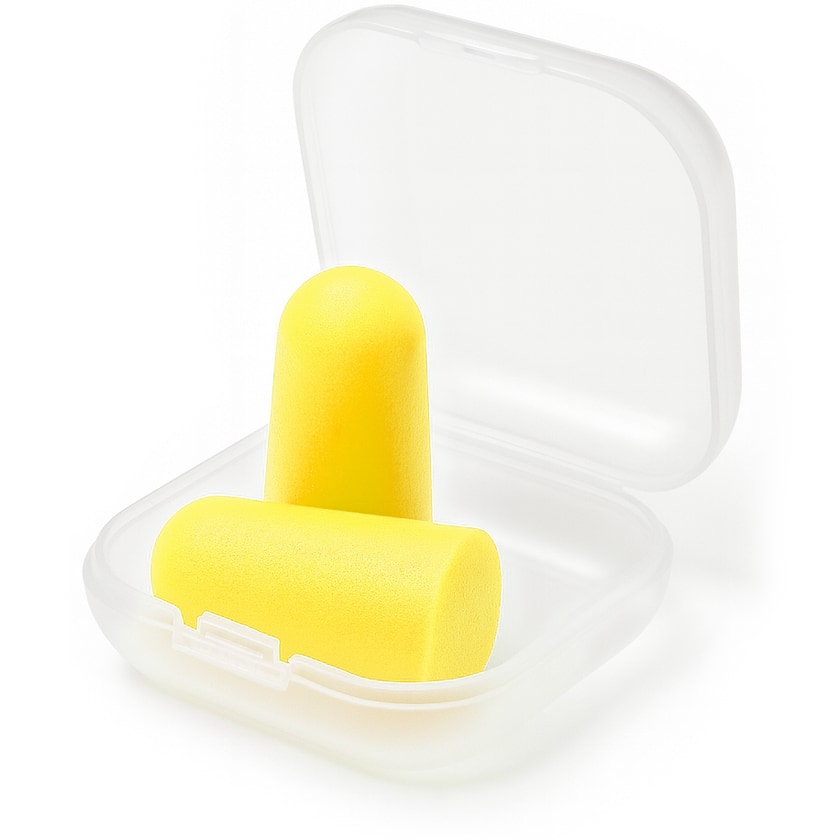 Fargeglade ørepropper i transparent plastboks. Øreproppene er laget i fleksibelt EVA-skum og sitter behagelig. Trykket skjer på esken.