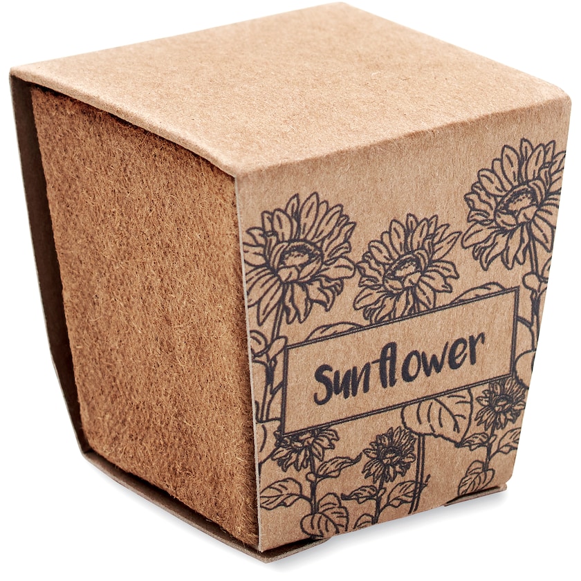Biologisk nedbrytbar krukke med solsikkefrø. Én jordbrikke inkludert. Dyrkesettet er laget i EU.