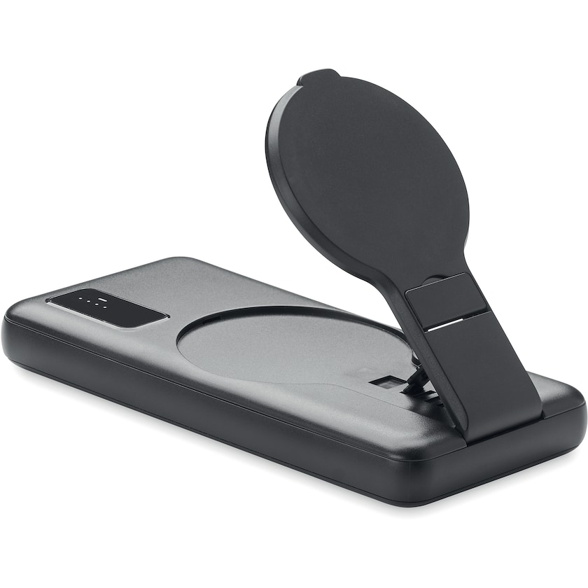 Powerbank med magnetisk stativ og trådløs lader. Kompatibel med iPhone 12 og nyere. Inkludert ekstra magnetisk metallring for å støtte lading av andre trådløst oppladbare telefoner som ikke er magnetiske.