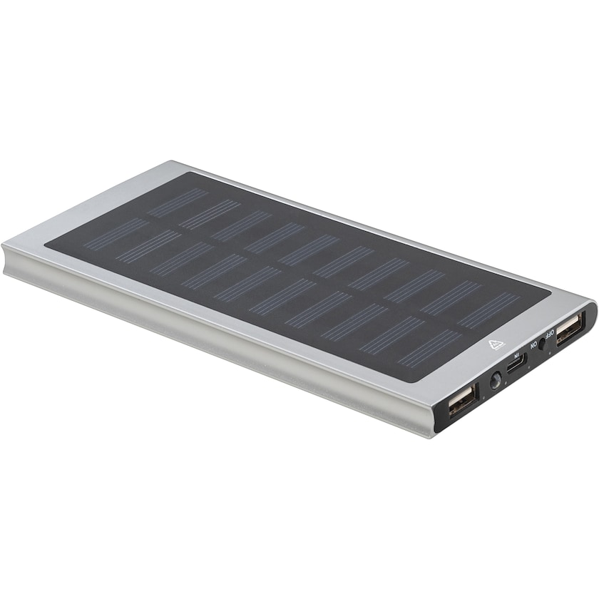 Powerbank av resirkulert aluminium med solpanel. USB-A/USB-C kabel inklduert. Leveres i en naturfarget pappeske.
