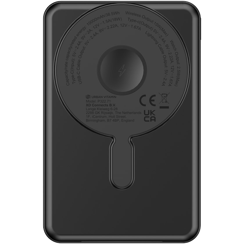 Kraftig powerbank med rask, trådløs, magnetisk lading. Lading kan også gjøres via USB-C-porten eller den innebygde lightning-kabelen i powerbanken, da går ladingen ennå raskere. Powerbanken har et stativ, som også gjør at den fungerer som et mobilstativ. Trykket plasseres på stativet.
