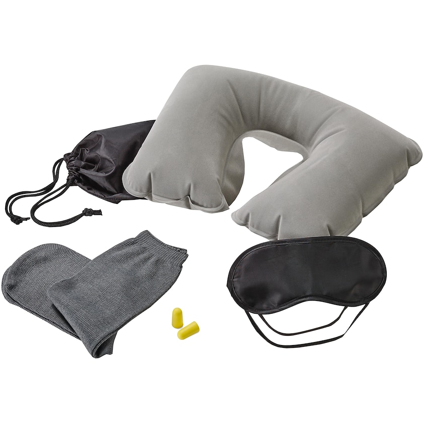 Reisesett med alt som behøves for en trivelig reise. Settet inneholder oppblåsbar nakkepute, sovemaske, ørepropper og strømper. Leveres i sort oppbevaringspose.