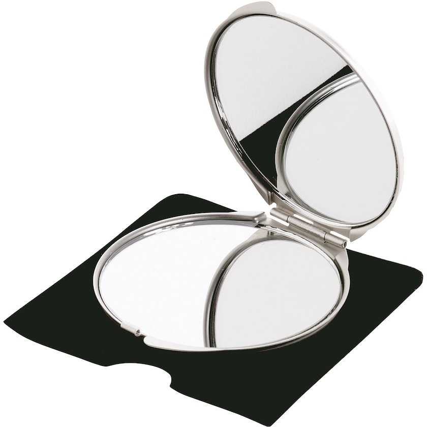 Sminkespeil med både vanlig og forstørrelses-speil. Angelina er laget av aluminium og leveres i et sort futteral. Merking skjer med lasergravering.