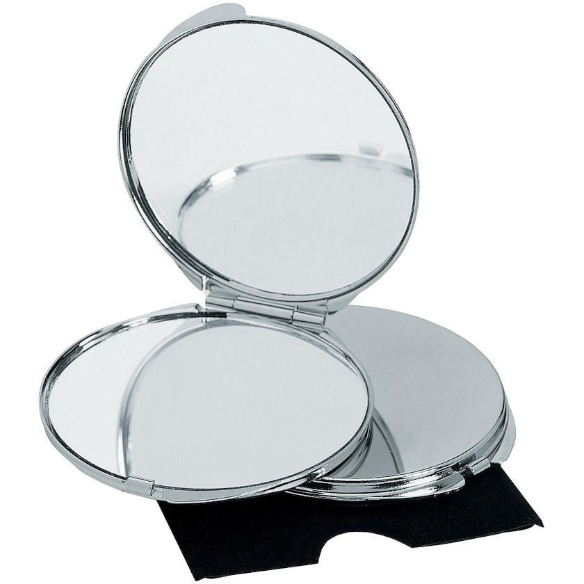 Sminkespeil i krom metall. Noah har et vanlig og ett forstørrende speil. Speilet leveres i et sort futteral. Merking skjer med lasergravering.