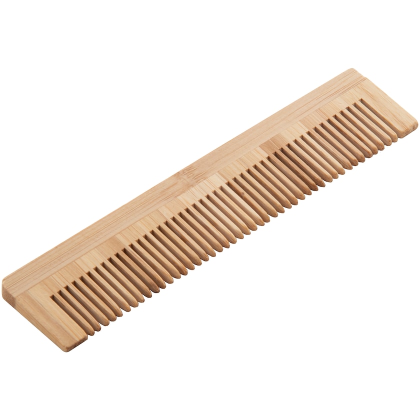 Kam i høy kvalitet av ekte bambus. Kammen leveres i et naturfarget pappfutteral. Merking kan enten skje med trykk eller lasergravering.
