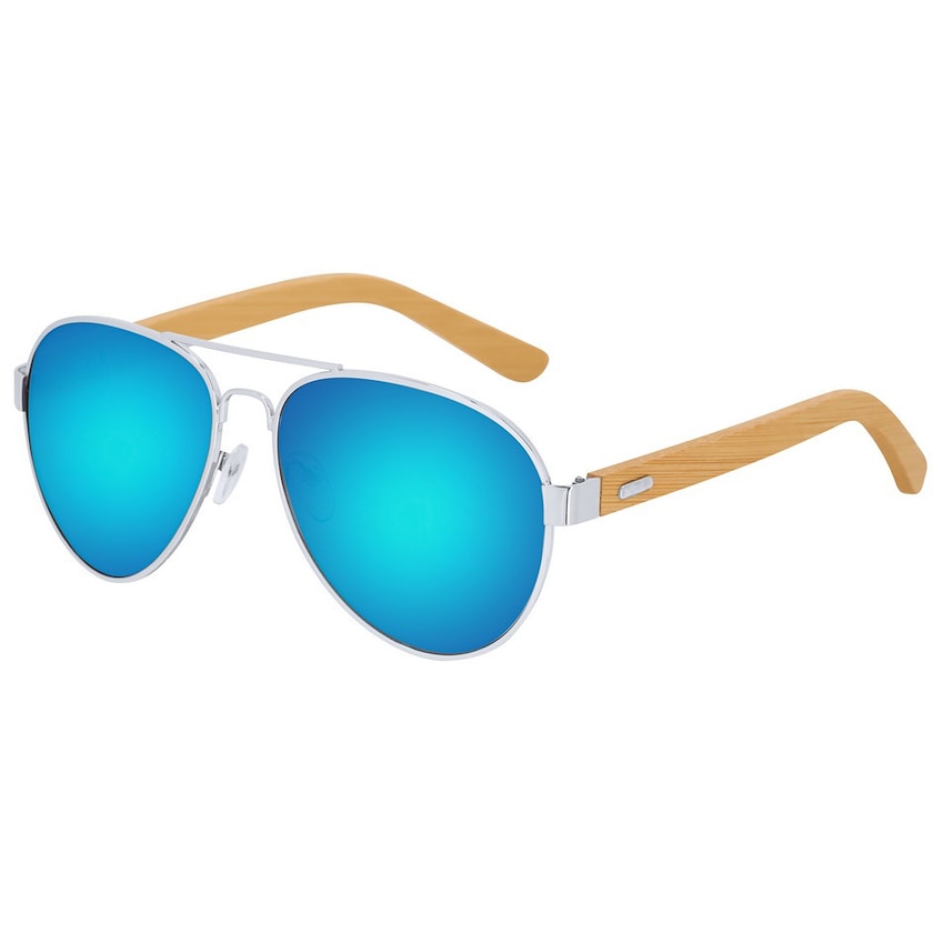 Solbriller av typen pilotbriller med speilglass. Brilleglassene har UV400-beskyttelse. Stengene er laget av bambus. Leveres i en pose av mikrofiber.
