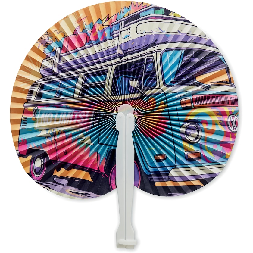 Håndvifte med trykk over hele overflaten. Handviften er laget av plast og papir. Trykket gjøres på den ene siden av håndviften. Ettersom håndviften lages på fabrikk etter bestilling, er leveringstiden lengre enn vanlig.