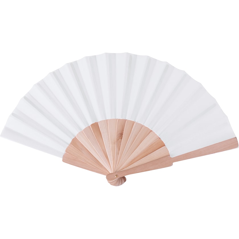 Håndvifte av tre og solid stoff av polyester og bomull. Merking gjøres med trykk eller lasergravering på trespilene.