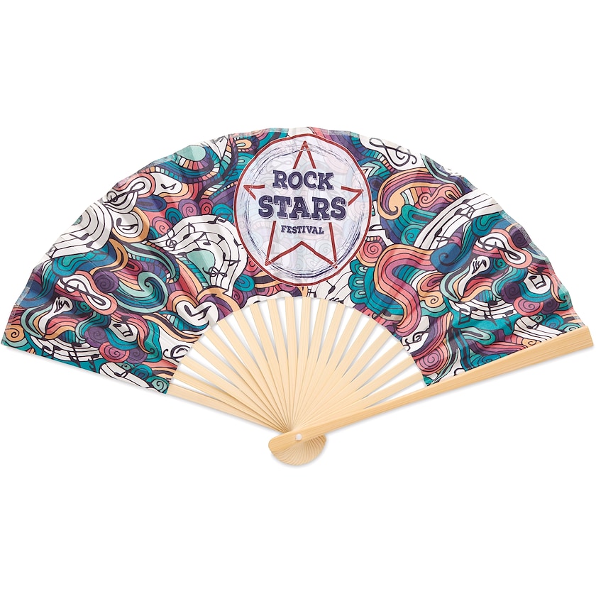 Håndvifte med trykk over hele den ene siden av håndviften. Zaragosa, er laget av bambus og 80 grams papir. Hele overflaten, som er dekket med trykk på bildet, kan trykkes etter eget ønske. Last ned trykkmalen og lag din egen unike håndvifte i dag!