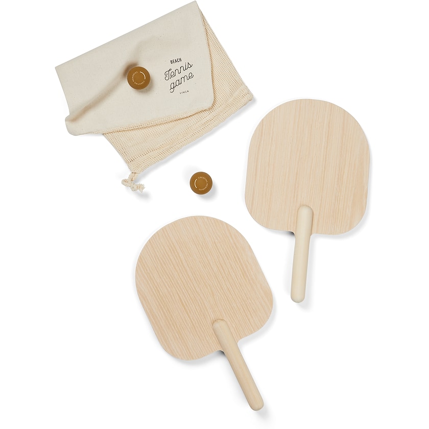 Strandtennissett i tre fra Vinga. Artig underholdning på stranden, i parken eller hjemme i hagen. Settet inneholder to racketer, to gummiballer og en oppbevaringspose av bomull. Hver racket er på 350 x 210 mm og er laget av FSC-sertifisert finér.