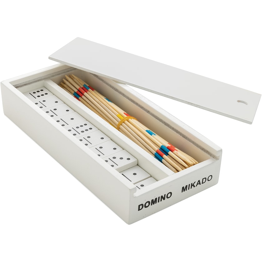 Settet inneholder mikado og domino. Boksen er laget av miljømerket treverk. En hyggelig gave til alle som liker å spille.