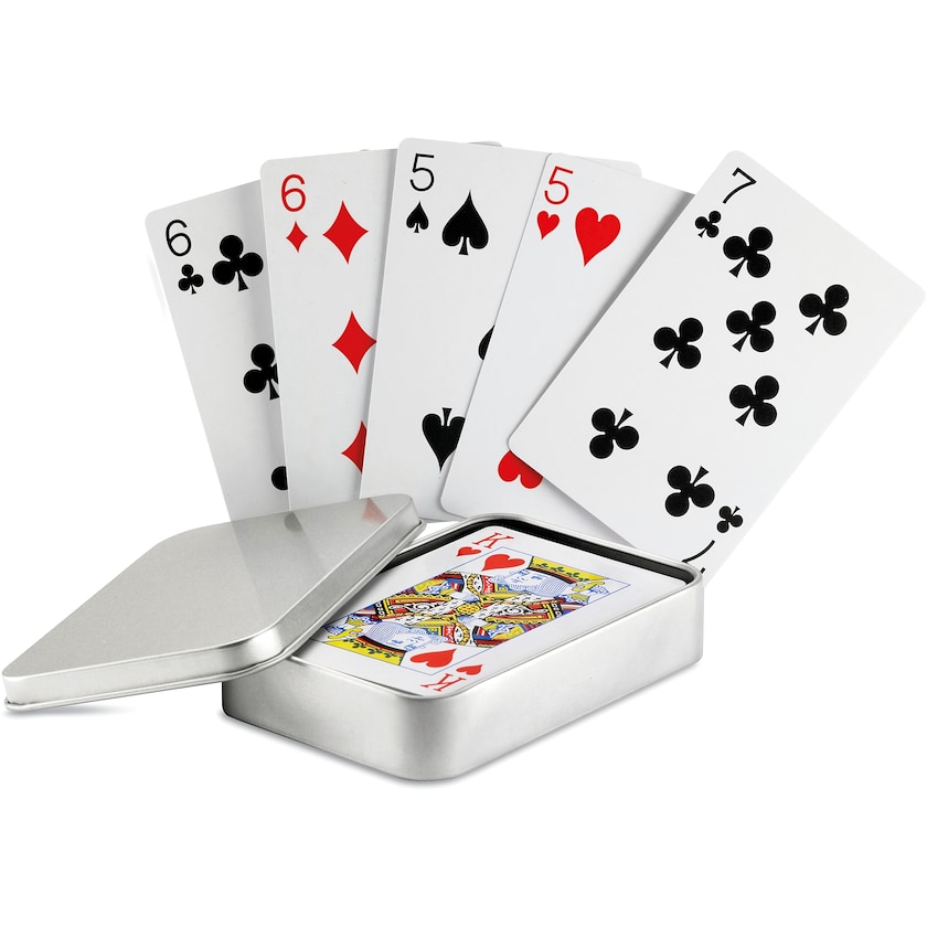Sett med kortstokk i en metalleske. Kortstokken inneholder 54 kort. Det er bare trykk på metallesken.