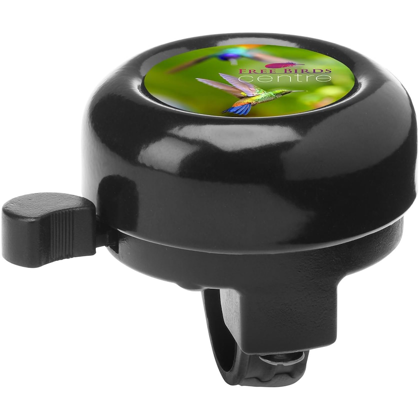 Ringeklokke til sykkel. Ringeklokken er laget av metall. Trykket gjøres med digitaltrykk som plasseres under et beskyttende epoksylag.