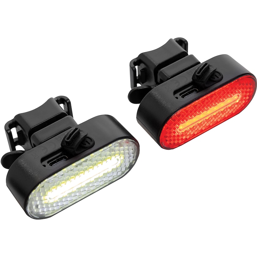 Oppladbar front- og baklykt til sykkel. Sykkellyktene er laget av resirkulert ABS. De lades opp på en time via USB-C kabel og har deretter en driftstid på ca. 2,5 timer.