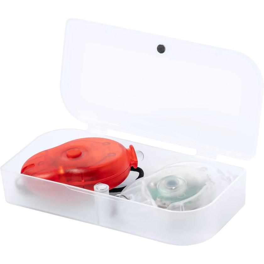 Sett med for- og baklykt til sykkel. Lampene har to lysnivåer. Trykket gjøres på plastesken.