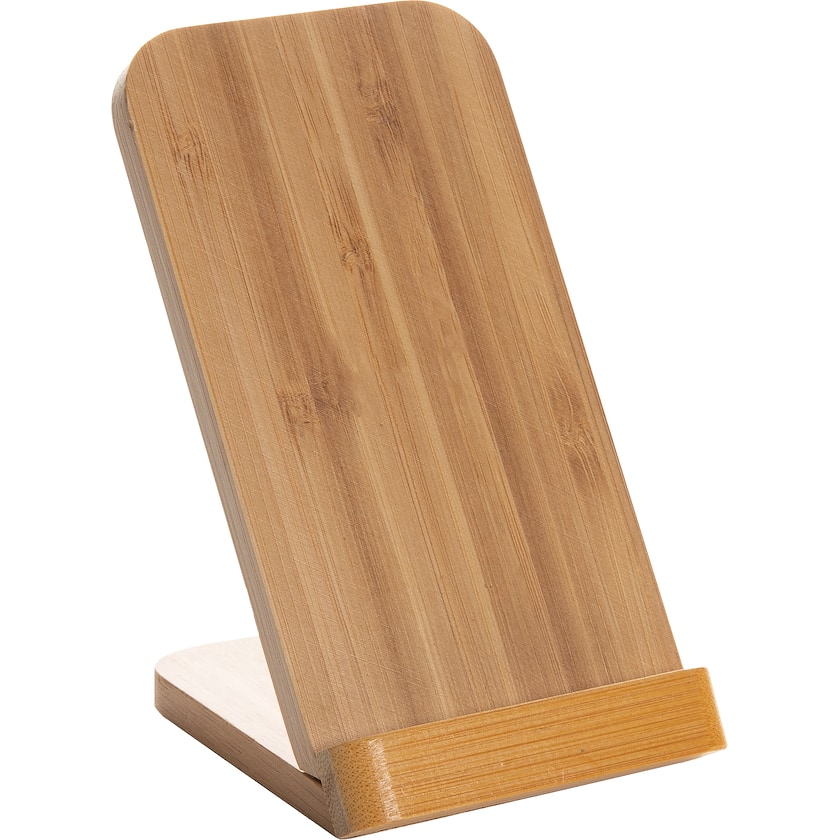 Trådløs lader av miljømerket bambus. Fungerer også som et praktisk mobilstativ. Leveres med en mikro USB-kabel av resirkulert TPE.