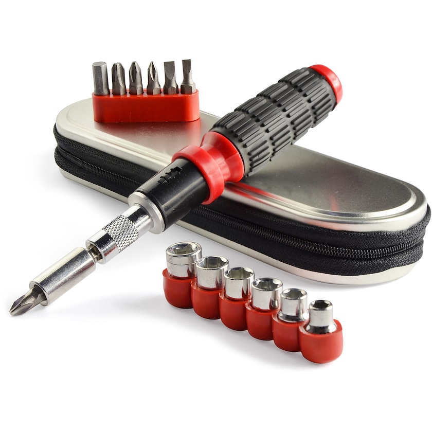 Profesjonelt verktøysett med skrutrekker og bits. Settet leveres i en praktisk metallboks med glidelås. Merking skjer på esken.