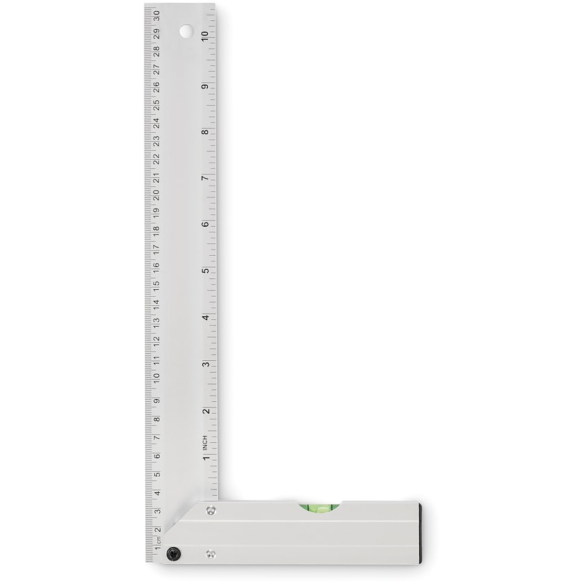 Vinkelhake av aluminium med vater. Merking kan enten gjøres med trykk eller lasergravering.