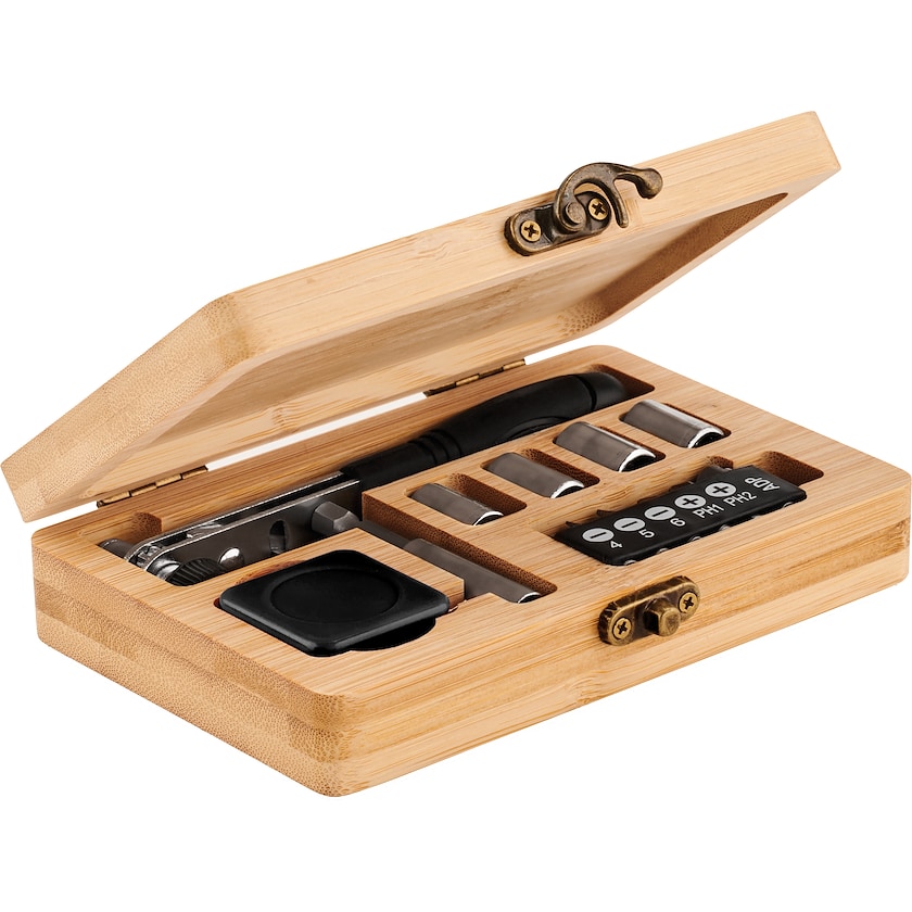 Påkostet verktøykasse av bambus. En perfekt gave til f.eks. nye huskjøpere. Merking kan enten gjøres med 1-fargetrykk eller lasergravering.