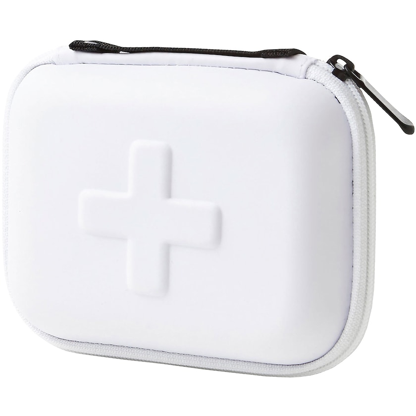 Pent førstehjelpsett i boks med preget kors. Inneholder sårvask, bandasje, saks, teip, sikkerhetsnåler, triangelbandasje, plaster, pledd med mer. Oppbevaringsboksen er laget av solid EVA-skum og er utstyrt med glidelås og håndtak. Trykk kan skje i maksimalt en farge.
