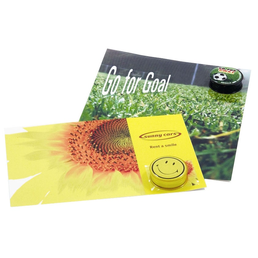 Liten boks med 3 gram leppepomade pakket sammen med et kort med digitaltrykk. Kortet trykkes på begge sider og kan ha ulike motiv. Lokket har en dome-etikett med digitaltrykk med ditt motiv. Perfekt til utsendelser av direktereklame.